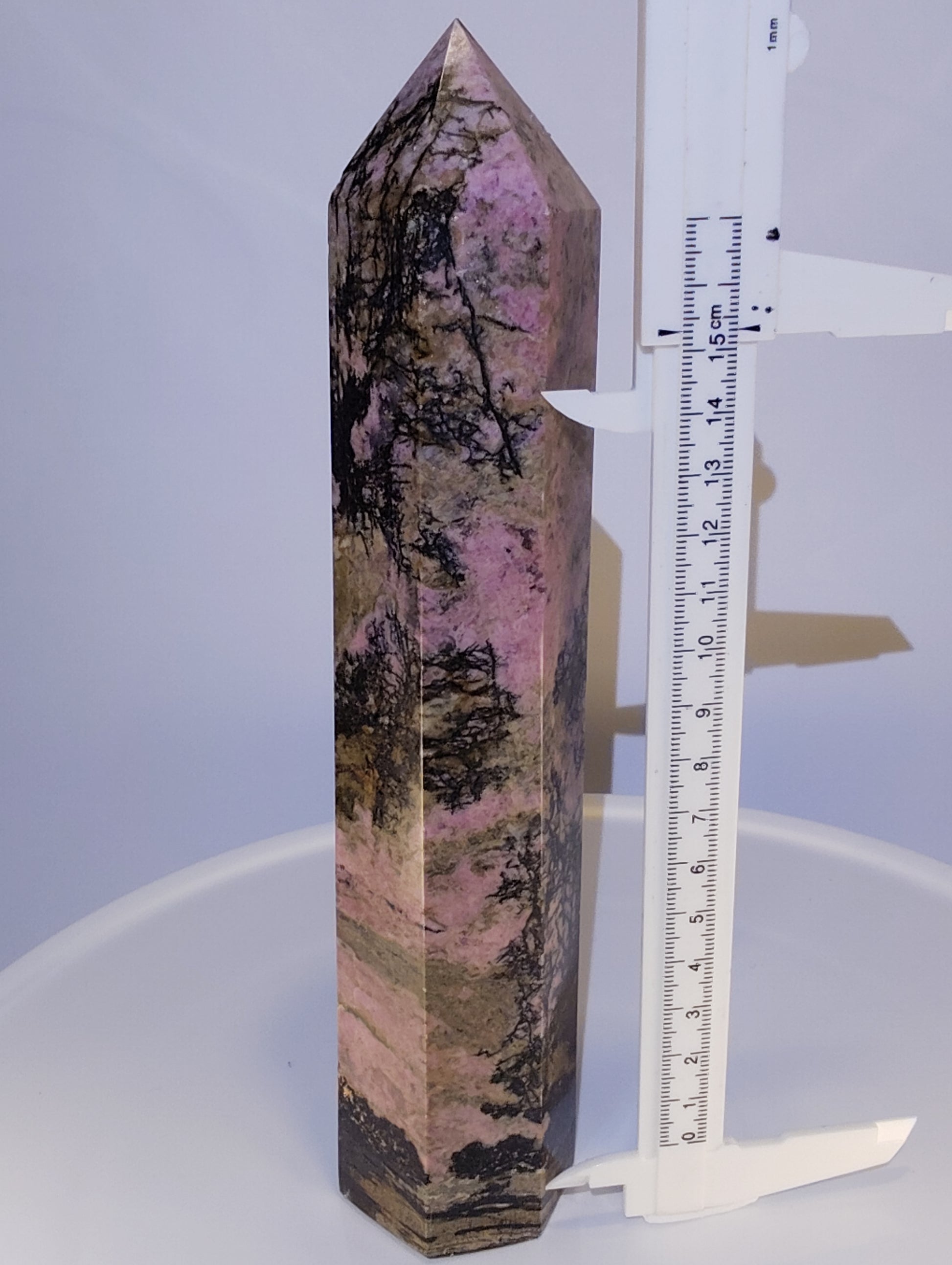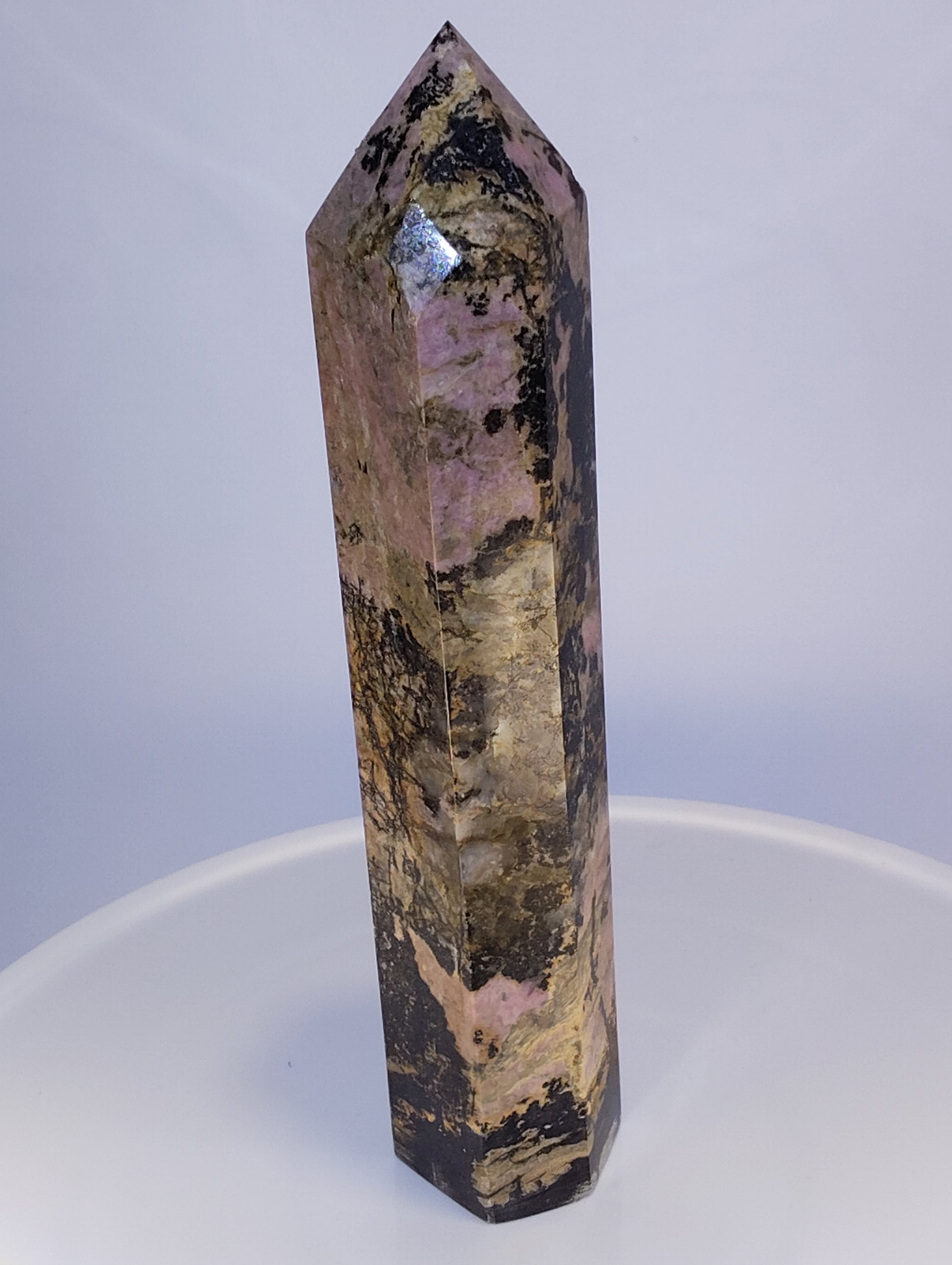 This polished hexagonal tower blends rhodonite with traces of quartz and manganese oxide, sourced from the mineral-rich regions of China or Pakistan. Its collector-grade polish highlights intricate dendrites and the fine transitions between minerals.